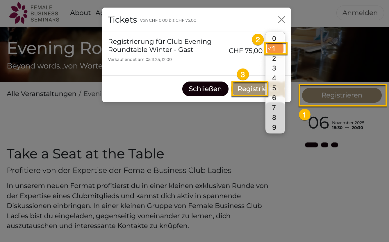 - Gehe dazu auf den gewünschten Event und klicke dort auf Button Registrieren 1️⃣, danach wähle beim Anzahlfeld 2️⃣ nur "1" aus, danach klicke auf den Button Registrieren 3️⃣
