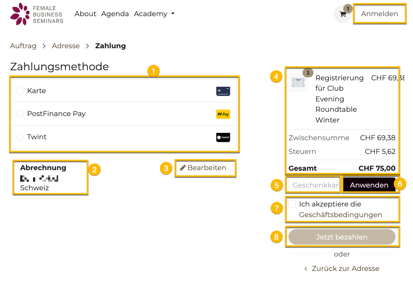- 1️⃣ = Wähle die Zahlungsmethode aus. Für Events bei welchen Die Zahlungsmethoden angezeigt werden kann zwischen Kreditkarte Master und Visa Card, PostFinance Pay und Twint ausgewählt werden. Eine Bezahlung auf Rechnung ist nicht möglich.