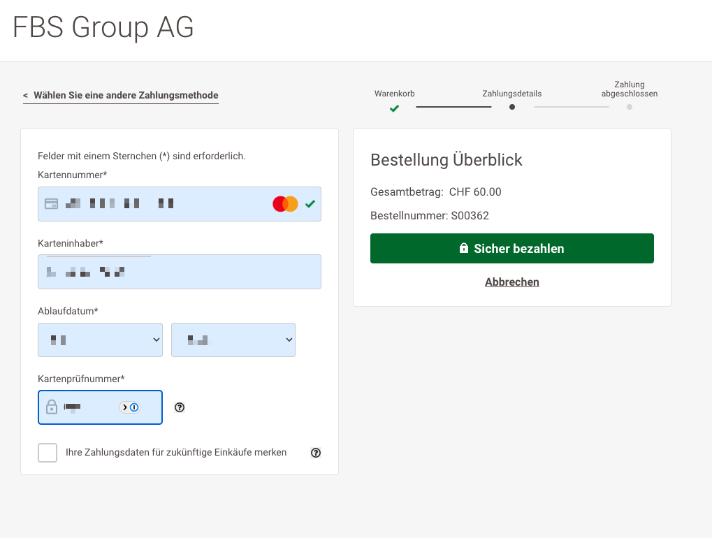 - Wenn Button Jetzt bezahlen angeklickt wird erscheint die Zahlungsmaske von Worldline. (Als Beispiel zeigen wir die Masken, wenn per Kreditkarte bezahlt wird)
